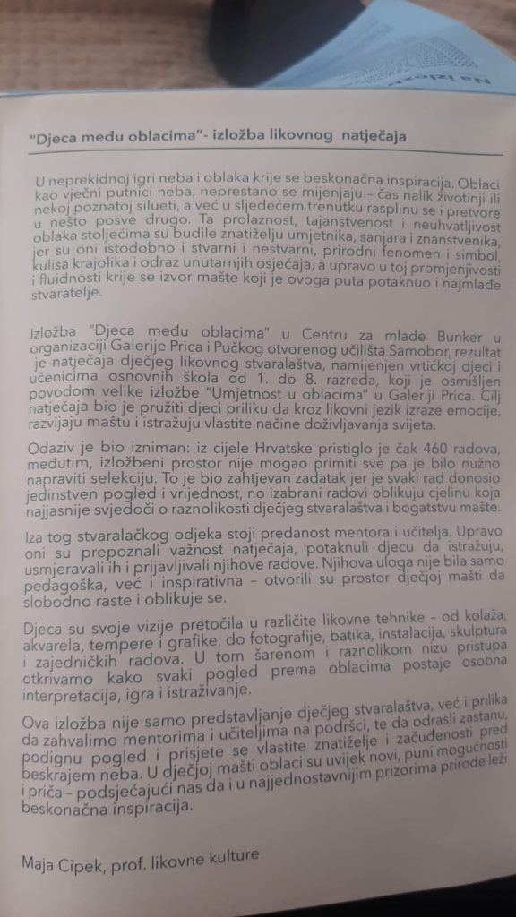 U Samoboru je otvorena izložba „Djeca među oblacima“ 22. listopada te je otvorena do 19. studenog. Na izložbi sudjelovali su radovi djece starijih vrtićkih skupina (prošlogodišnji Vrapčići i Ribice). Na izložbu je pristiglo preko 460 radova, a s ponosom možemo reći da je naš vrtić odabran među najboljima.