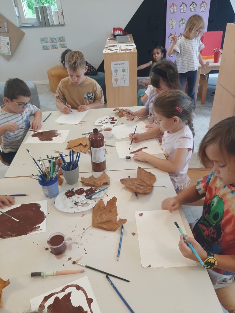 Jesen obiluje prirodnim poticajima za igru te se njima potiče djecu na istraživanje i stvaranje. Kroz mjesec rujan istraživali smo oblike, veličine, boje, teksturu i mirise jesenskih plodova – grožđa, kukuruza, kestena, oraha, jabuka, gljiva, ukrasnih tikvica. U likovnim aktivnostima koristili smo olovku (kukuruz, grožđe), pastele ( tikvice), tempere (kiša, list).